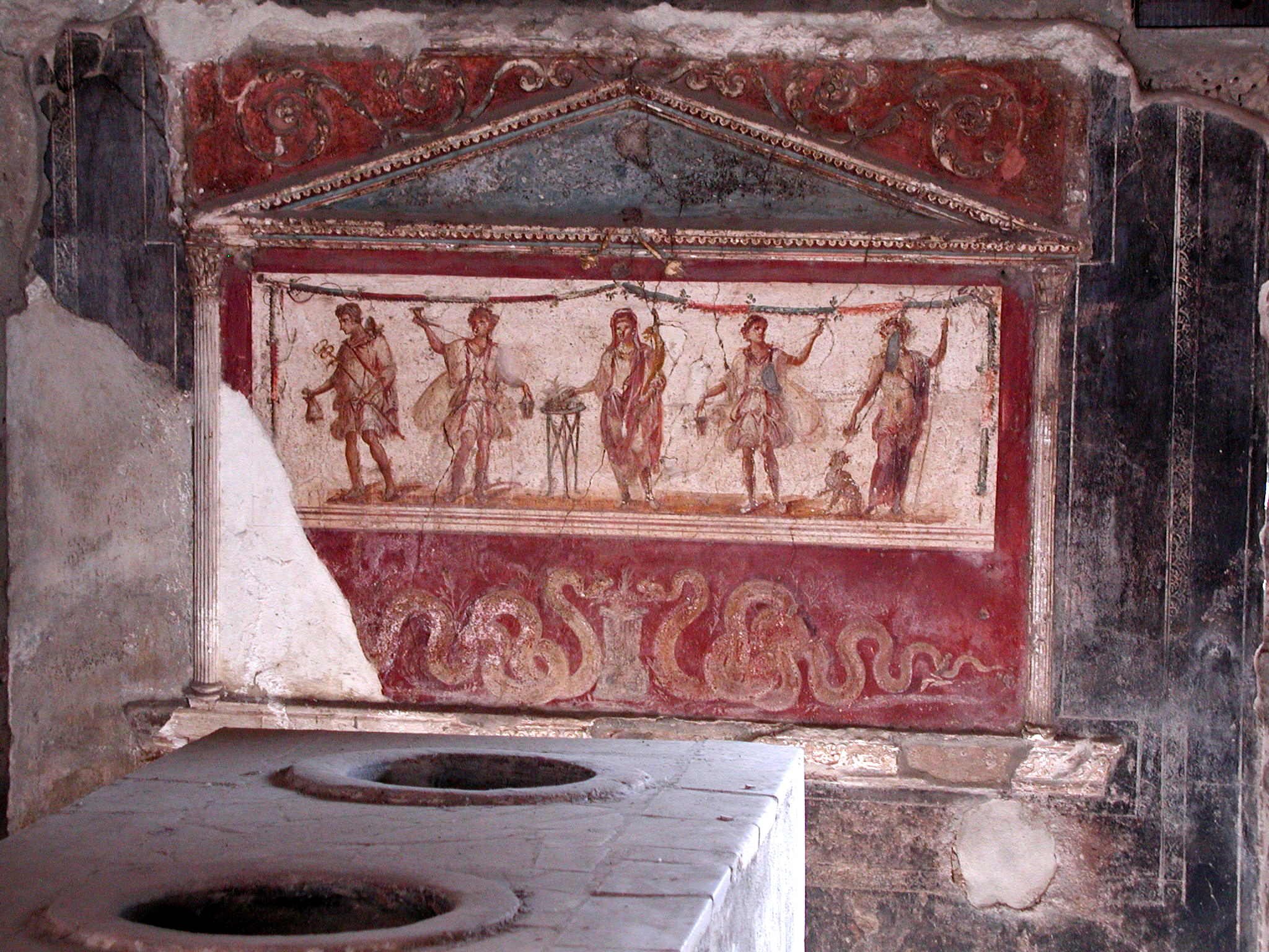 As an art historian, it was a glorious experience to travel to Italy and visit Pompeii. Throughout the thousands of homes, business, and public buildings, I enjoyed hunting down wall paintings. Many are quite famous, and have been photographed numerous times. Some, like this small painting in a Roman-era fast-food joint, are hiding in plain sight. You simply have to go into each and every building looking for these hidden gems. How do I know it’s a fast-food joint? Notice the jugs set into a counter below the painting. This establishment is on the outside of the house of Vetutius Placidus. What’s a Lararium? It’s a small shrine to the gods of a household or establishment. In homes, it’s often located in the atrium or near the hearth. There are several located throughout the massive Pompeii site.